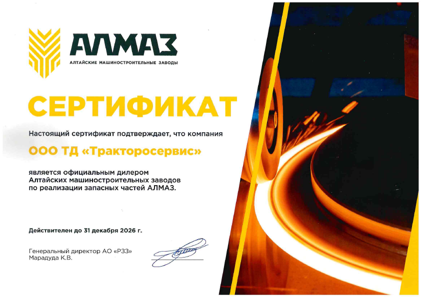 Сертификат дилера Алтайских машиностроительных заводов по реализации запасных частей АЛМАЗ