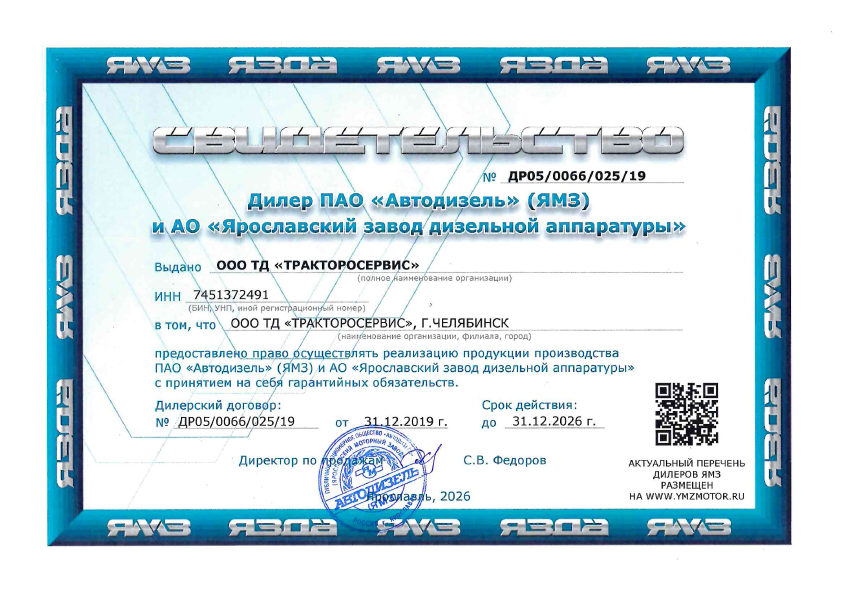 Свидетельство дилера ПАО "Автодизель" (ЯМЗ) и АО "Ярославский завод дизельной арматуры"